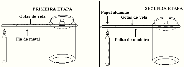 A idéia é mostrar a propagação de calor por condução através de dois materiais diferentes: um fio elétrico, que conduz bem o calor, e um palito de madeira, que conduz mal o calor. Para isso pingamos gotas de vela com espaçamento constante no fio e no palito. Em seguida aquecemos uma das extremidades do fio. As gotas de vela vão se derretendo conforme o fio vai se aquecendo. Ou seja: conforme o calor vai se propagando no fio, as gotas de vela vão se derretendo. O mesmo não acontece quando aquecemos uma das extremidades do palito, pois a madeira não conduz calor tão bem quanto o metal. Portanto, quando se aquece uma das extremidades do palito, as gotas de vela não derreterão do mesmo modo como derreteram quando o fio foi aquecido.